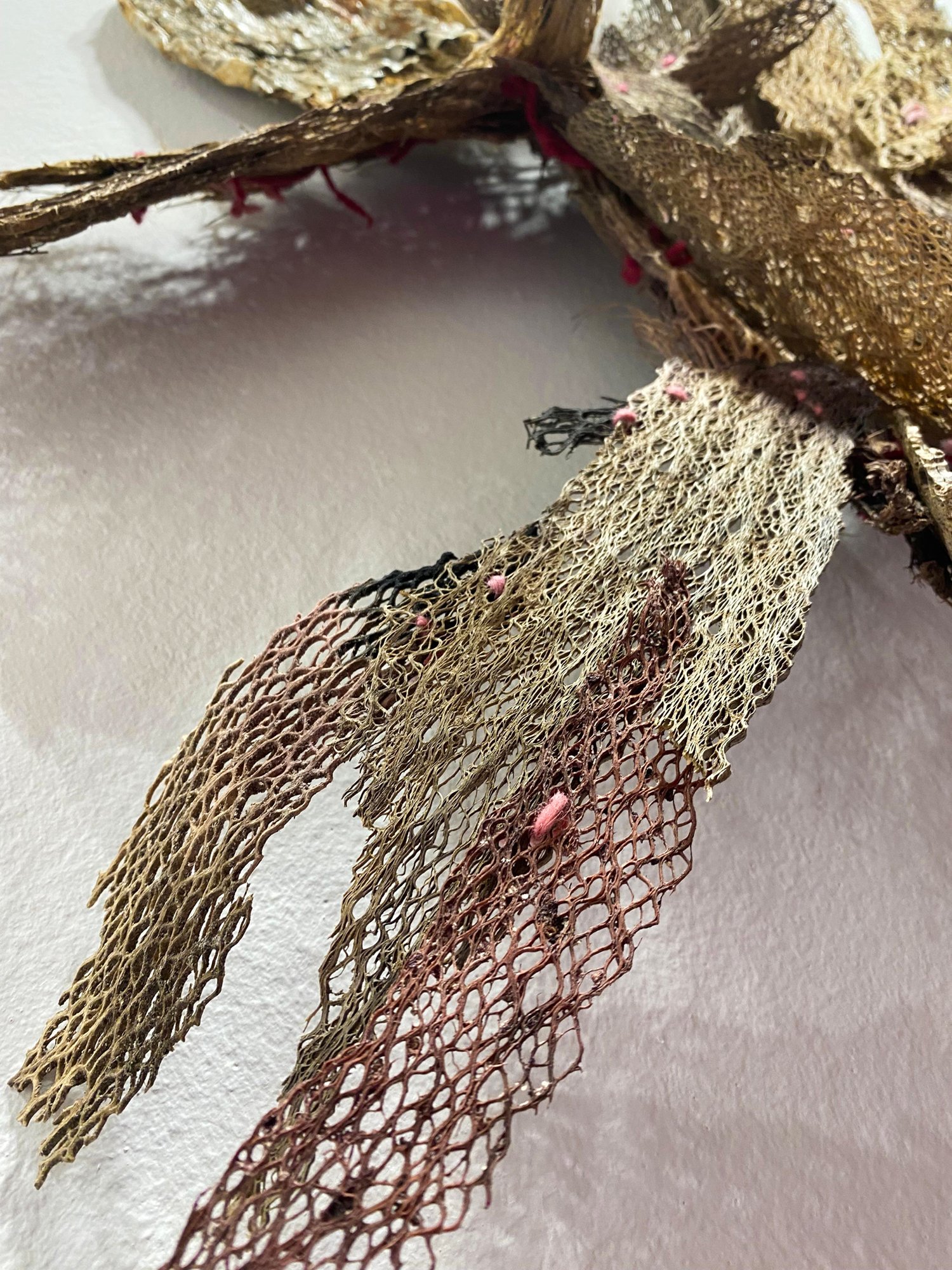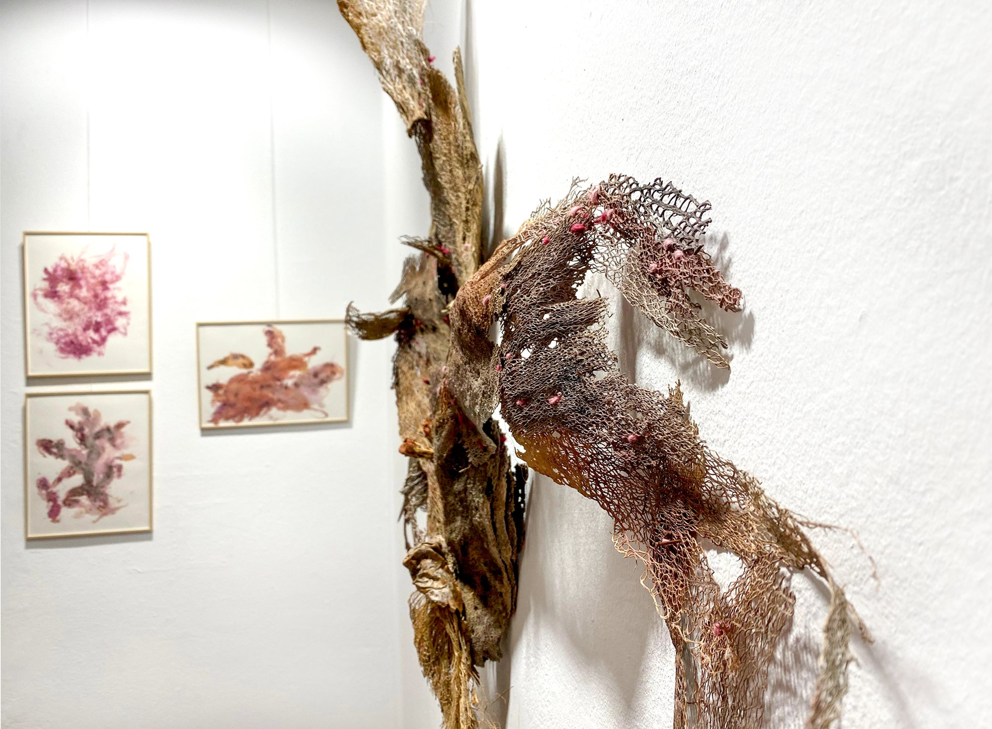 Site-specific installation of prickly pear cactus internal reticulated structures, some dyed with cochineal, like wool they are sewn together with. 2025