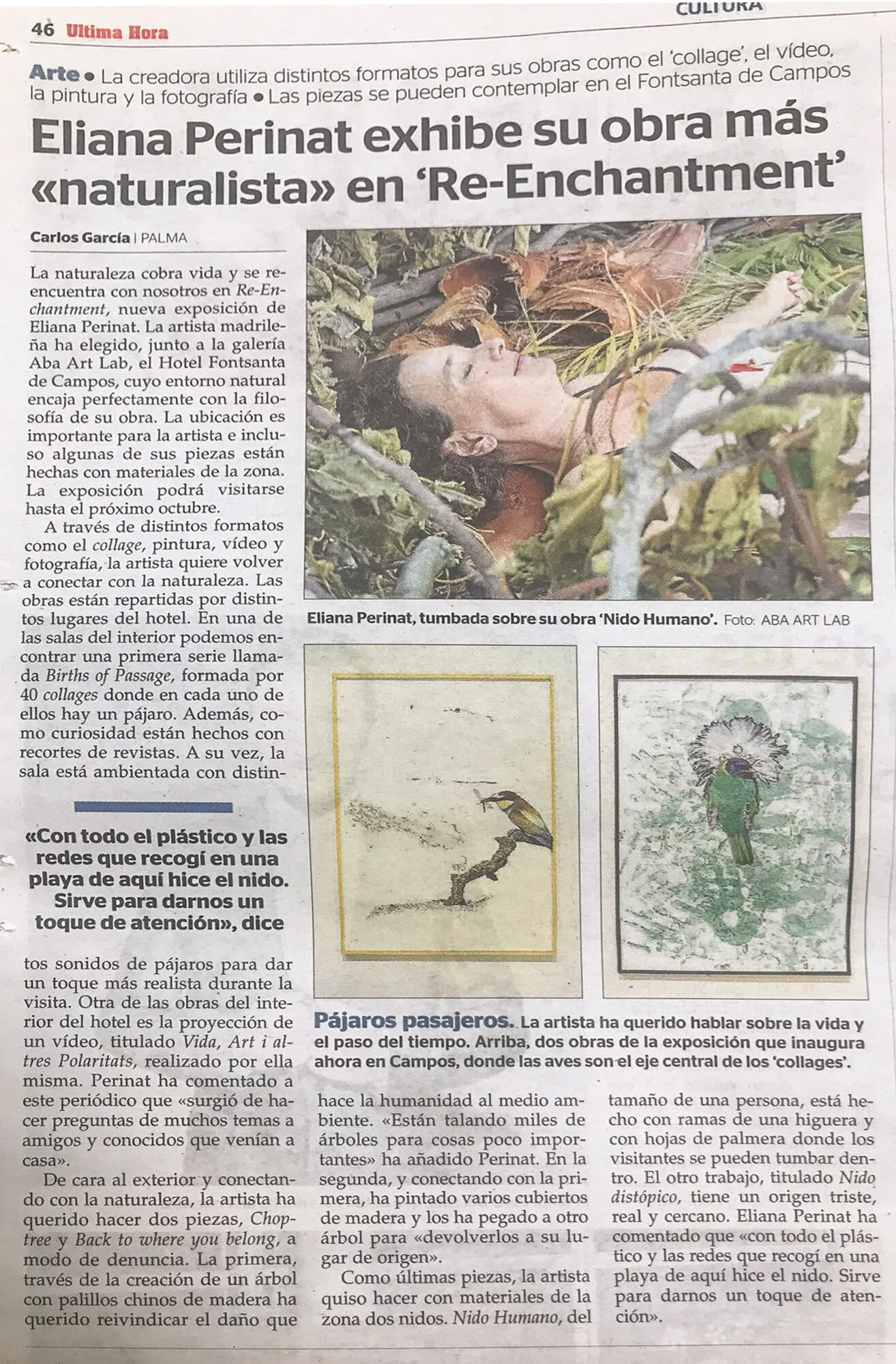 Birds of Passage, son collages creados con imágenes de aves, que están desapareciendo del mundo, y materiales de deshecho de mi trabajo artístico y arteterapéutico. Dialogando con ellos, en el jardín de la exposición Re-enchantment creé un nido de dimensiones humanas y otro de desechos encontrados en playas.
